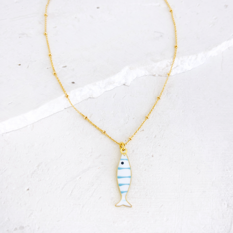 Introducing NONA, our catch of the day! She's the perfect layering necklace and fun addition to your jewelry stack, featuring a white and blue striped enamel fish charm.