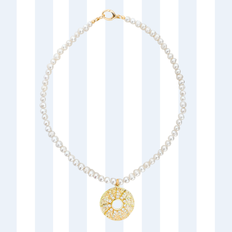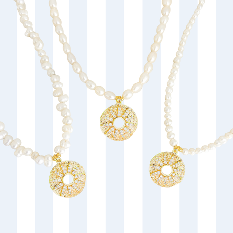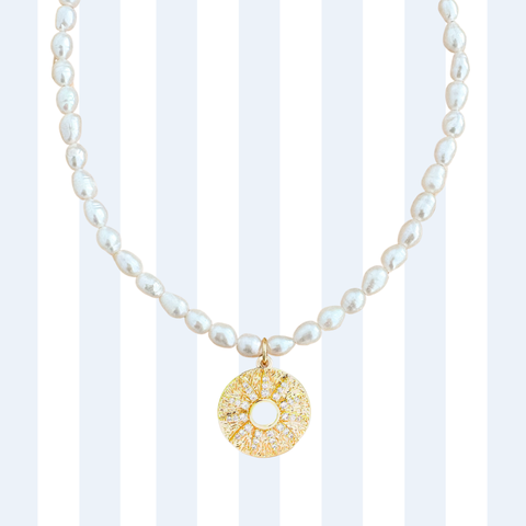 She’s sophisticated, elegant, and effortlessly chic - meet our CAMILLE Pearl Charm Necklace. Handmade with 100% natural freshwater pearls and a sparkling round sun charm, she glows just as brightly as you do.