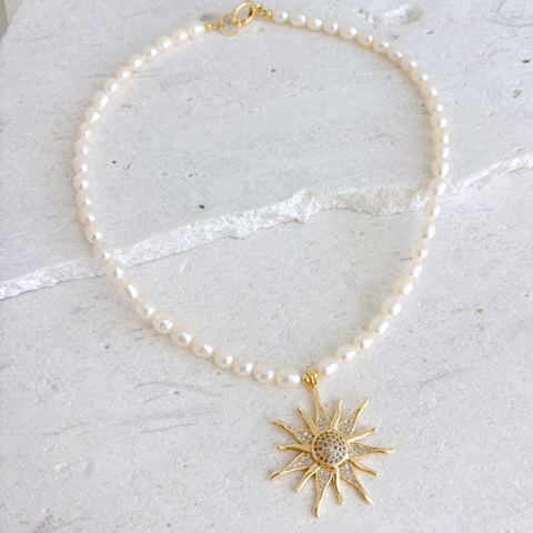 Handmade in Florida with 100% natural freshwater pearls and finished with a 24k gold-plated sun charm and clasp, she layers effortlessly or shines beautifully all on her own.