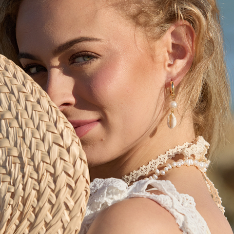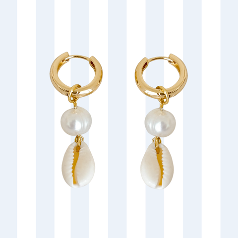 A coastal twist on our classic pearl hoops? Shell yeah! Our BELLA hoops bring seaside sparkle to your everyday look, handmade with natural freshwater pearls and cowrie shell pendants on 24k gold-plated hoops.