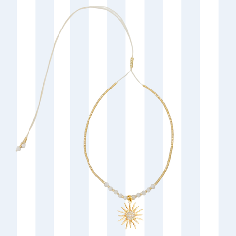 Hello Sunshine! Our adjustable SUNSHINE CHOKER features a 24k gold-plated sunshine pendant on a beaded adjustable necklace designed to make you shine even brighter.